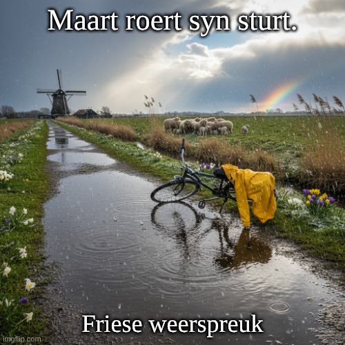 Afbeelding: Peter van Geest AI. 🧠 Betekenis:Maart is een grillige maand: Het weer kan plots omslaan met wind, regen, hagel of zelfs sneeuw. Het gezegde waarschuwt dat de winter in maart nog “na-ijlt” en zich soms nog even laat voelen. 🌦️ 🐾 Beeldspraak: “Roert zijn staart” verwijst naar een dier dat onvoorspelbaar met zijn staart slaat: speels, maar soms venijnig. Het verbeeldt de kuren van het maartse weer. 🕰️ Oorsprong:Taal: West Fries (syn = zijn, sturt = staart). Regionaal gebruik: Vooral in Fryslân; de Nederlandse vorm is overal in Nederland en Vlaanderen bekend. 🌍 Volkswijsheid uit de Lage Landen, ontstaan uit agrarische / weerobservaties in de overgang van winter naar lente. In druk overgeleverd sinds minstens de 17e–18e eeuw; nadien breed gedocumenteerd in spreekwoordenverzamelingen. De uitdrukking is vermoedelijk nog ouder in de mondelinge traditie. 📜 ✍️ Auteur: Geen individuele auteur: het is een anoniem, traditioneel spreekwoord uit de volksmond.
