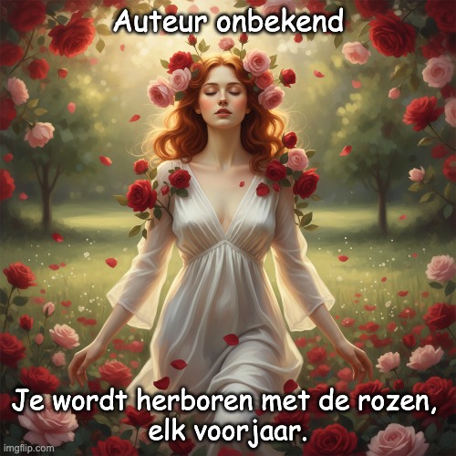 Afbeelding: Peter van Geest AI. Betekenis🌹: De uitspraak symboliseert een prachtig idee van vernieuwing, hoop en cyclische wedergeboorte.Hergeboorte: Het verwijst naar het idee dat je, net als de natuur, elk jaar een nieuwe start kunt maken. Oude zorgen of moeilijkheden verdwijnen en maken plaats voor nieuwe energie en perspectieven. Rozen: Rozen zijn vaak symbolen van schoonheid, liefde en de vergankelijkheid van het leven. In dit geval vertegenwoordigen ze de bloei en vitaliteit die elk voorjaar terugkeert. Elk voorjaar: Dit benadrukt de regelmaat en de onvermijdelijkheid van deze vernieuwing. Na elke winter volgt er een lente, en zo ook in het leven. Het biedt troost en het vooruitzicht op betere tijden. 🌍 Oorsprong en Auteur: De exacte oorsprong van deze specifieke formulering is moeilijk te traceren, maar het is een sentiment dat sterk overeenkomt met de thematiek in de romantische en symbolistische poëzie van de 19e en vroege 20e eeuw. Dichters uit deze stromingen waren vaak gefascineerd door de natuur, de seizoenen, en de cyclus van leven en dood als metaforen voor menselijke emoties en ervaringen. Vaak toegeschreven aan Juan Ramón Jiménez maar hij is niet de auteur van deze exacte zin, het past wel perfect bij de beelden en gevoelens die hij in zijn gedichten opriep. Zijn werk stond bekend om zijn gevoeligheid, de nadruk op de innerlijke wereld en zijn sterke verbinding met de natuur, zoals te zien is in zijn beroemde werk “Platero y yo”. Het is goed mogelijk dat het een algemeen poëtisch gezegde is geworden, of een vertaling van een soortgelijk sentiment uit een ander gedicht of literaire bron.