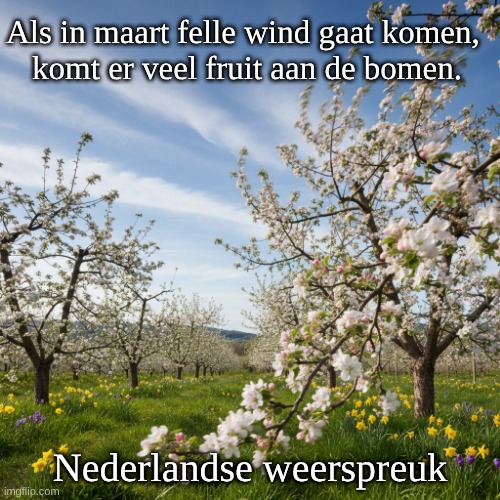 Afbeelding: Peter van Geest AI. Betekenis🌬️🍎:  Kernboodschap: Deze spreuk suggereert een verband tussen winderig weer in maart en een overvloedige fruitopbrengst later in het jaar. Mogelijke verklaringen: Bestuiving: Harde wind kan helpen bij de verspreiding van stuifmeel, wat essentieel is voor de bestuiving van fruitbomen. Hoe meer effectieve bestuiving, hoe meer vruchten. Ziekte- en plaagbestrijding: Een krachtige wind kan ook schadelijke insecten en schimmelsporen van bomen waaien, waardoor de bomen gezonder blijven en beter vrucht kunnen dragen. Verharding van de natuur: Sterke wind kan de bomen “verharden” en ze weerbaarder maken tegen latere weersinvloeden. Indicatie van een koude maart: Vaak gaat felle wind in maart gepaard met koudere temperaturen. Een koude maart kan de bloei van fruitbomen vertragen, wat gunstig kan zijn omdat de bloesems dan minder risico lopen op bevriezing door late nachtvorst. Als de bloei later in een stabielere periode valt, is de kans op succesvolle vruchtzetting groter. Oorsprong: Volkswijsheid: Net als vele andere weerspreuken is deze spreuk waarschijnlijk ontstaan uit generatieslange observaties van boeren en tuiniers. Mensen die afhankelijk waren van de natuur voor hun levensonderhoud, ontwikkelden een diepgaand begrip van patronen en verbanden in het weer en de landbouw. Empirische kennis: Het is een vorm van empirische kennis, gebaseerd op ervaring in plaats van wetenschappelijke theorieën. Deze spreuken dienden als praktische gidsen voor het voorspellen van oogsten en het plannen van landbouwactiviteiten. Auteur: Anoniem: Het is vrijwel onmogelijk om een specifieke auteur voor deze weerspreuk aan te wijzen. Weerspreuken zijn doorgaans collectieve uitingen van volkswijsheid en zijn organisch gegroeid binnen gemeenschappen. Ze werden mondeling doorgegeven en soms pas veel later opgeschreven in verzamelingen van spreuken en gezegden.