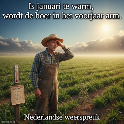 Afbeelding: Peter van Geest AI. Betekenis: Inhoud: Deze spreuk suggereert dat wanneer januari warmer is dan normaal, dit negatieve gevolgen kan hebben voor de landbouw in het voorjaar. Uitleg: Een warme januari kan leiden tot vroege groei van gewassen. Dit kan gevaarlijk zijn, omdat latere vorst de jonge planten kan beschadigen. Dit resulteert in lagere oogsten en financiële problemen voor boeren. Oorsprong:Traditionele wijsheid: Deze spreuk is een voorbeeld van volkse wijsheid die door de jaren heen is doorgegeven. Agrarische context: De spreuk komt voort uit de directe ervaring van boeren met de seizoenen en het weer, en hun afhankelijkheid van natuurlijke omstandigheden voor een goede oogst. Auteur:Anoniem: Zoals veel weerspreuken, is de exacte auteur onbekend. Deze spreuken zijn vaak het resultaat van collectieve kennis en ervaring van generaties boeren. Conclusie: Deze spreuk illustreert de sterke band tussen klimaat en landbouw en benadrukt de kwetsbaarheid van de agrarische sector voor weersveranderingen. 🌾🌡️
