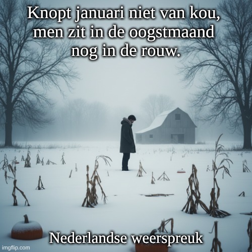 Afbeelding: Peter van Geest AI. Betekenis:Interpretatie: Dit citaat verwijst naar januari als een maand die niet direct geassocieerd wordt met kou, maar eerder met een periode van rouw en reflectie. Het suggereert dat januari, ondanks het winterse weer, ook een tijd is waarin mensen zich bezighouden met verlies en de gevolgen van de oogstmaand (september/oktober). Oorsprong:Context: Het citaat komt uit de Nederlandse volkswijsheid en weerspiegelt de seizoensgebonden veranderingen en de emotionele impact die deze kunnen hebben op de mensen. Het benadrukt de cyclus van leven, dood en de natuur. Auteur: Herkomst: Het citaat is een traditionele Nederlandse spreuk en de specifieke auteur is onbekend. Het behoort tot de folklore en wordt vaak gebruikt om de seizoenen en hun betekenis te beschrijven. Extra Informatie : Seizoensgebonden Symboliek: Januari: Nieuwe beginnen, reflectie, rouw. Oogstmaand: Tijd van overvloed maar ook van verlies (bijvoorbeeld van gewassen). Toepassing: Dit soort citaten worden vaak gebruikt in literatuur, poëzie en gesprekken over de natuur en menselijke emoties.