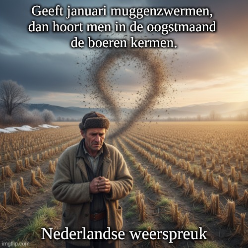 Afbeelding: Peter van Geest AI. Betekenis: Inhoud: Deze weerspreuk verwijst naar de relatie tussen het weer in januari en de oogst in de maanden daarna. Interpretatie: Muggenzwermen in januari wijzen op een milde winter. Een milde winter kan leiden tot een slechte oogst in de zomermaanden, wat resulteert in de ‘kermen’ (klagen) van boeren tijdens de oogstmaand. Oorsprong:Traditie: Deze spreuk is een voorbeeld van de volkswijsheid die weersomstandigheden en landbouwresultaten met elkaar verbindt. Culturele Context: Dit soort spreuken komt vaak voor in de Nederlandse en Vlaamse folklore, waar men de seizoenen en weerpatronen nauwlettend observeerde. Auteur: Anoniem: De specifieke auteur van deze spreuk is onbekend. Het is een traditioneel gezegde dat door de jaren heen is doorgegeven binnen de cultuur. Samenvatting: Deze weerspreuk benadrukt de gevolgen van het weer in januari op de landbouw in de oogstmaand en is een reflectie van de agrarische levensstijl van vroeger. 🌾🌧️