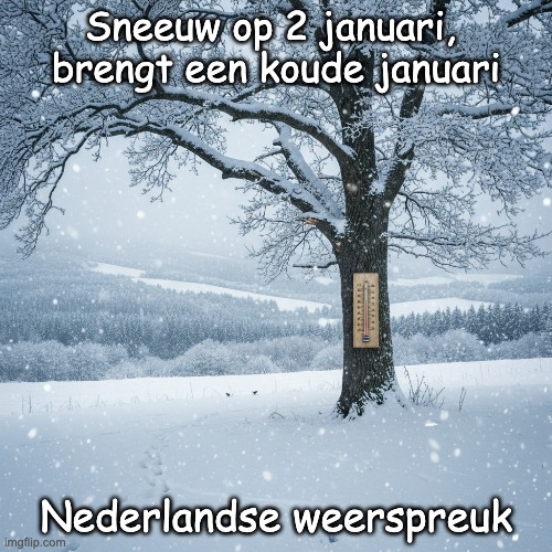Afbeelding: Peter van Geest AI. Betekenis:Interpretatie: Deze spreuk geeft aan dat wanneer er op 2 januari sneeuw valt, dit kan wijzen op een koudere rest van de maand januari. Het suggereert dat de weersomstandigheden in deze specifieke periode een indicatie kunnen zijn voor de temperatuur en weersomstandigheden die volgen. Seizoensgebonden Voorspelling: Voor veel mensen, vooral in agrarische gemeenschappen, kan deze spreuk belangrijk zijn voor het plannen van activiteiten en het begrijpen van de winterse omstandigheden. Oorsprong Folklore en Traditie: De spreuk is ontstaan uit de traditionele volkswijsheid en weersvoorspellingen die door de jaren heen zijn doorgegeven. Het weerspiegelt de observaties van het weer door generaties heen. Natuurlijke Observaties: Mensen hebben door de tijd heen opgemerkt dat sneeuwval op specifieke dagen vaak gepaard gaat met kou en dat deze patronen zich herhalen. Auteur: Net als veel andere weerspreuken heeft deze spreuk geen specifieke auteur. Het is een onderdeel van de collectieve volkswijsheid en is ontstaan uit de ervaringen van verschillende gemeenschappen in Nederland en Vlaanderen. Conclusie: De spreuk is een voorbeeld van hoe mensen de natuur en het weer observeren en deze kennis vertalen in praktische wijsheid. Het benadrukt de relatie tussen weersomstandigheden en seizoensgebonden veranderingen, en blijft relevant in de hedendaagse cultuur.