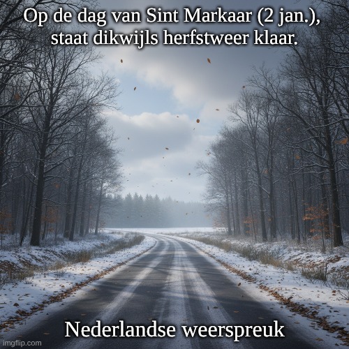Afbeelding: Peter van Geest AI. Betekenis: De tekst verwijst naar een weerspreuk in de Nederlandse folklore. Het suggereert dat op 2 januari, de feestdag van Sint Markaar, vaak herfstachtig weer te verwachten is. Oorsprong: Dit soort weerspreuken zijn vaak ontstaan uit eeuwenlange observaties van het weer en seizoensgebonden veranderingen. Ze worden gebruikt om verbanden te leggen tussen bepaalde datums en weersomstandigheden. Auteur: Dit specifieke citaat lijkt geen bekende auteur te hebben, maar is meer een onderdeel van de volksmond en traditionele weerspreuken in Nederland. Opmerking: Weerspreuken zoals deze zijn vaak generaties lang doorgegeven en kunnen regionaal variëren. Ze vormen een interessant onderdeel van de culturele geschiedenis en het begrip van het weer.
