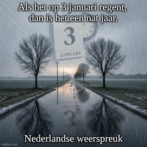 Afbeelding: Peter van Geest AI. Betekenis: Deze weerspreuk suggereert dat regen op 3 januari een voorteken is voor een vochtig of nat jaar. Het idee is dat het weer op deze specifieke datum een indicatie kan zijn voor het algemene weerpatroon in de rest van het jaar. Oorsprong: Niet exact te traceren, maar het is een voorbeeld van hoe folklore en tradities zijn ontstaan rondom het weer. Veel van dit soort spreuken zijn door de eeuwen heen doorgegeven in de volksmond en zijn gebaseerd op observaties van natuurverschijnselen. Auteur: Geen specifieke auteur of bron aan te wijzen voor deze spreuk. Het is een traditioneel gezegde dat in de loop der tijd door verschillende generaties is overgeleverd. Samenvatting: De spreuk is een reflectie van de menselijke neiging om patronen te zoeken in het weer en om voorspellingen te doen op basis van natuurlijke observaties. Het is een mooi voorbeeld van volkswijsheid die weer en seizoenen verbindt met de menselijke ervaring.