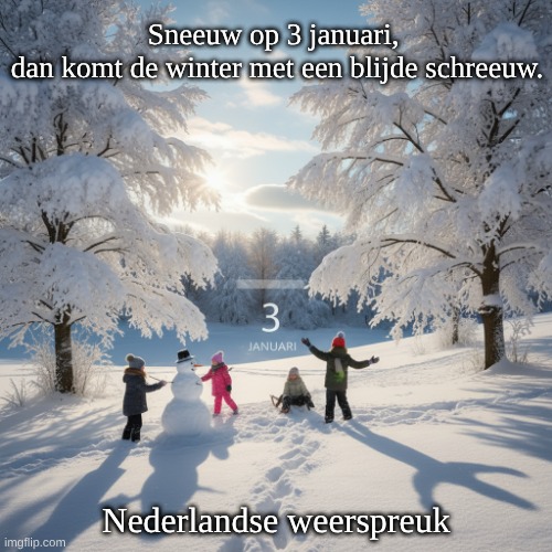 Afbeelding: Peter van Geest AI. Betekenis: Deze weerspreuk geeft aan dat als er sneeuw valt op 3 januari, dit een teken is dat de winter zich op een sterke en positieve manier aankondigt. De uitdrukking “met een blijde schreeuw” suggereert dat de komst van sneeuw als iets vreugdevols en opbeurends wordt gezien, wat vaak geassocieerd wordt met de schoonheid en magie van de winter. Oorsprong: Is moeilijk te traceren, maar zoals veel weerspreuken, komt het voort uit eeuwenoude observaties van natuur en seizoenen. Het is een voorbeeld van hoe mensen door de tijd heen patronen in het weer hebben waargenomen en deze hebben vastgelegd in de vorm van spreekwoorden. Auteur: Geen specifieke auteur of bron bekend voor deze spreuk. Het is een traditioneel gezegde dat in de volksmond is ontstaan en doorgegeven, vaak binnen lokale gemeenschappen. Samenvatting: Deze weerspreuk weerspiegelt de menselijke verbinding met de seizoenen en de vreugde die sneeuw kan brengen in de winter. Het laat zien hoe folklore en ervaringen met het weer door de generaties heen zijn doorgegeven.