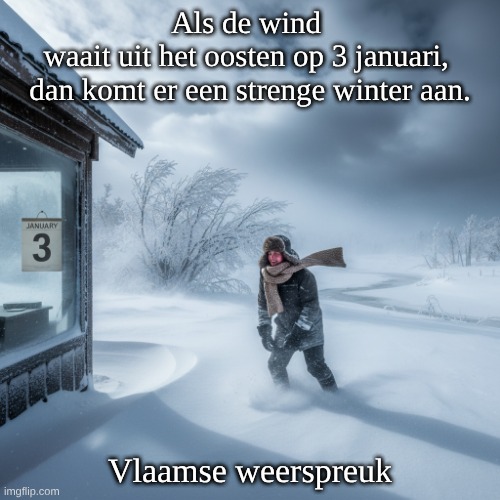 Afbeelding: Peter van Geest AI. Betekenis: Deze weerspreuk suggereert dat als de wind op 3 januari uit het oosten waait, dit een indicatie is voor een strenge winter die volgt. Oostelijke winden worden vaak geassocieerd met koude luchtstromen, vooral in de winter, wat kan leiden tot lagere temperaturen en meer sneeuw. Oorsprong: De oorsprong van deze spreuk is moeilijk precies te traceren, maar het is een voorbeeld van traditionele volkswijsheid die door de jaren heen is doorgegeven. Veel weerspreuken zijn ontstaan uit observaties van lokale weerpatronen en de invloed daarvan op het klimaat en de seizoenen. Auteur: Er is geen specifieke auteur of bron bekend voor deze spreuk. Het is een traditioneel gezegde dat in de volksmond is ontstaan en vaak in verschillende varianten in Nederland en Vlaanderen voorkomt. Samenvatting: Deze weerspreuk weerspiegelt de menselijke neiging om patronen in het weer waar te nemen en om voorspellingen te doen op basis van natuurlijke verschijnselen. Het benadrukt de impact van windrichtingen op het weer en de seizoenen.