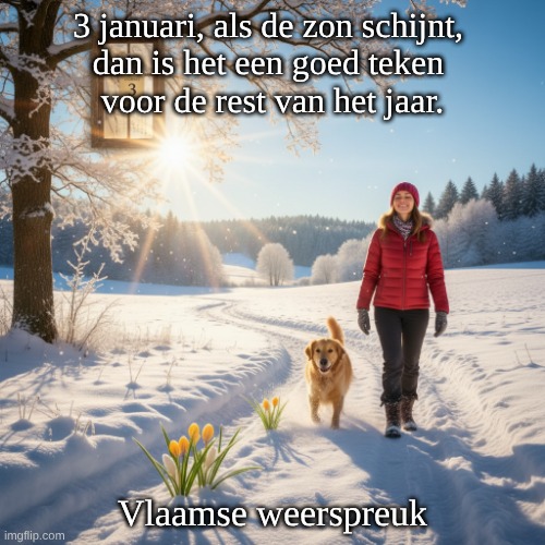 Afbeelding: Peter van Geest AI. Betekenis: Deze weerspreuk suggereert dat wanneer de zon op 3 januari schijnt, dit een positief voorteken is voor het komende jaar. Het idee is dat zonnig weer op deze specifieke dag een indicatie kan zijn van geluk, voorspoed of een gunstig verloop van zaken in de rest van het jaar. Oorsprong: De oorsprong van deze spreuk is niet precies te achterhalen, maar zoals veel weerspreuken, komt het voort uit eeuwenoude observaties van de natuur en seizoenen. Dit soort gezegden zijn vaak ontstaan in agrarische samenlevingen, waar het weer een grote invloed had op het leven en de oogsten. Auteur: Er is geen specifieke auteur of bron bekend voor deze spreuk. Het is een traditioneel gezegde dat in de volksmond is ontstaan en doorgegeven, vaak binnen verschillende gemeenschappen in Nederland en Vlaanderen. Samenvatting: Deze weerspreuk weerspiegelt de hoop en optimisme die mensen hebben wanneer ze zich bezig houden met de seizoenen en het weer. Het laat zien hoe folklore en menselijke ervaringen met de natuur door de generaties heen zijn doorgegeven.