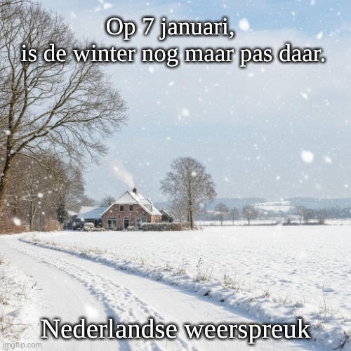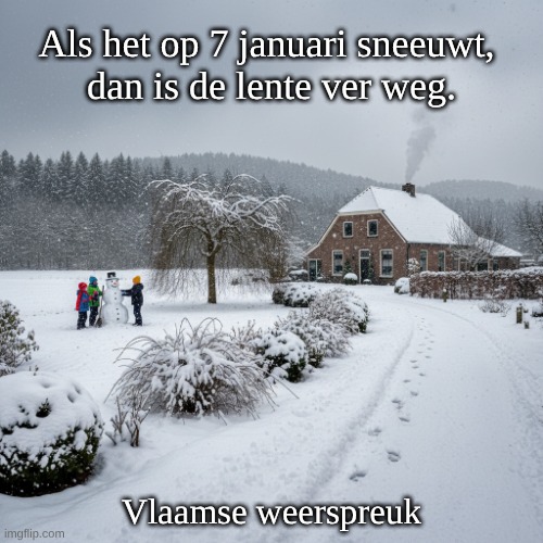 Afbeelding: Peter van Geest AI. Betekenis: Interpretatie: Deze spreuk suggereert dat regen op 7 januari een indicatie kan zijn dat de winterse omstandigheden nog niet voorbij zijn. Het weerspiegelt de verwachting dat als het weer in deze periode mild of nat is, we nog niet van de winter af zijn. Seizoensgebondenheid: Het benadrukt de relatie tussen het weer en de seizoenen, waarbij regen als een teken kan worden gezien dat de winter zijn grip nog niet heeft verloren. Oorsprong: Volkswijsheid: Deze spreuk is een voorbeeld van volkswijsheid en weerspreuken die door de jaren heen zijn doorgegeven in de Nederlandse en Vlaamse cultuur. Traditie: Veel van dergelijke spreuken zijn ontstaan uit observaties van het weer en seizoensveranderingen, vaak door boeren en mensen die afhankelijk waren van de natuur voor hun levensonderhoud. Auteur: Anoniem: De meeste weerspreuken, inclusief deze, hebben geen specifieke auteur. Ze zijn vaak het resultaat van collectieve kennis en ervaring die door generaties heen is doorgegeven. Culturele Context: De spreuk is ontstaan in een tijdperk waarin mensen veel meer afhankelijk waren van de natuur en het weer, wat leidde tot het creëren van dergelijke uitspraken. Conclusie: De spreuk weerspiegelt de traditionele kennis over het weer en de seizoenen in de Lage Landen. Het is een anonieme uitspraak die zijn oorsprong vindt in de volkscultuur.