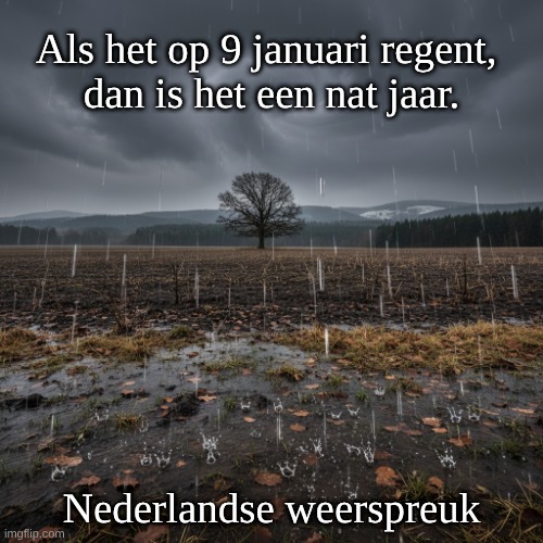 Afbeelding: Peter van Geest AI. Betekenis:Interpretatie: Deze weerspreuk suggereert dat regen op 9 januari een voorspelling is voor een nat jaar. Het idee is dat het weer op deze specifieke dag een indicatie kan zijn van de neerslag die gedurende het jaar zal vallen. Symboliek: Het weerspiegelt de volkswijsheid dat bepaalde dagen in het jaar een voorspellende waarde hebben voor de rest van het seizoen of jaar. Oorsprong:Culturele Context: Weerspreuken zijn vaak ontstaan uit observaties van het weer en de seizoenen door generaties heen. Ze zijn vaak doorgegeven in de volksmond en zijn onderdeel van de lokale folklore. Seizoensgebonden: Januari is een maand die vaak wordt geassocieerd met winterse weersomstandigheden, en het idee dat regen op een winterdag een indicatie is voor het jaar, komt voort uit de agrarische samenleving waar de weersomstandigheden cruciaal waren voor de oogst en het leven. Auteur:Anonieme Oorsprong: De meeste weerspreuken, waaronder deze, zijn anoniem en worden vaak niet toegeschreven aan een specifieke auteur. Ze zijn het resultaat van collectieve kennis en ervaring die is doorgegeven door de jaren heen. Volkswijsheid: Het is een voorbeeld van volkswijsheid, waarbij de oorsprong vaak verloren gaat in de geschiedenis. Conclusie: De spreuk is een interessante weerspreuk die ons herinnert aan de verbinding tussen weerobservaties en de natuur. Het laat ook zien hoe mensen in het verleden hun leven aanpasten op basis van de seizoenen en weersomstandigheden. 🌧️🌱