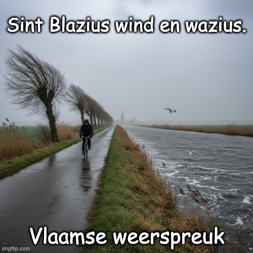 Afbeelding: Peter van Geest AI. Betekenis 🌬️🌫️: De spreuk zegt dat het rond de feestdag van Sint-Blasius vaak “windy en wazig” is: onstuimige wind met grijs, nevelig of miezerig weer. Vrije parafrase: “Op Sint-Blasius is het winderig en grijzig/wazig.”Oorsprong en context 🕯️:Volksweerkunde: Dit is een traditionele weerspreuk uit de Lage Landen (vooral Vlaanderen en Zuid-Nederland), ontstaan in de mondelinge volkscultuur en boerenalmanakken. Kalenderanker: Sint-Blasius valt op 3 februari, direct na Maria-Lichtmis (2 februari). Begin februari is klimatologisch vaak winderig en somber in de Benelux door frequente westenwinden en passerende lagedrukgebieden. Doel: Makkelijk te onthouden rijm om seizoensverwachting te duiden, geen strikte voorspelling voor die éne dag. Taalnoot over “wazius” ✍️: “Wazius” is geen standaard-Nederlands; het is een rijmende, dialectale of speelse vorm bij “wazig/waas(ig)” om op “Blasius” te rijmen. Je ziet varianten als “wazig,”“wazies,” of “waasjes.” De heiligennaam wordt ook geschreven als “Blasius” (vaker) of “Blazius.” Over Sint-Blasius 🙏: Sint-Blasius (Blasius van Sebaste) was een bisschop en martelaar (4e eeuw), patroonheilige tegen keelkwalen. Feestdag: 3 februari. In volksgebruiken is dit moment ook verbonden met winter-naar-voorjaar-overgang in weerwijsheden. Auteur ✒️:Geen individuele auteur: het is een anonieme, collectieve volksuitdrukking die via mondelinge overlevering en almanakken is doorgegeven.Varianten en verwantschap 🔁: Je kunt de spreuk ook aantreffen als “Sint-Blasius: wind en wazig” of met kleine dialectvarianten. Past in het rijtje van begin-februari-weerspreuken rond Lichtmis en Sint-Blasius die guur, winderig en grijs weer typeren. Betrouwbaarheid 🔎: Zoals de meeste weerspreuken is het meer klimatologische folk-wijsheid dan een exacte voorspelling. Statistisch is januari–februari wel gemiddeld een winderige periode in de Lage Landen, wat de spreuk plausibel maakt.