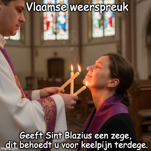 Afbeelding: Peter van Geest AI. Betekenis: In gewoon Nederlands: “Als Sint-Blasius je zegent, ben je goed beschermd tegen keelpijn.” Strekking: een devotionele belofte/hoop dat de zegen van de heilige Blasius bescherming biedt tegen keelkwalen. Oorsprong 🕯️: Heilige Blasius (Blasius/Blasius van Sebaste) 4e-eeuwse bisschop en martelaar, patroonheilige tegen keelziekten. Legende: Hij redde een jongen die stikte in een visgraat; vandaar zijn bijzondere voorspreking bij keelklachten. Ritueel: De Blasiuszegen: Datum: 3 februari (de dag na Maria-Lichtmis/2 februari). Gebruik: De priester houdt twee gekruiste, vaak gewijde kaarsen bij de keel en spreekt een zegen uit. Klassieke formule (Latijn): “Per intercessionem Sancti Blasii, episcopi et martyris, liberet te Deus a malo gutturis et a quolibet alio malo.” (“Moge God, op voorspraak van de heilige Blasius, u bevrijden van keelkwaal en al het andere kwaad.”)Waarom deze spreuk? Het is een korte, rijmende volksregel die de betekenis van de Blasiuszegen samenvat: wie de zegen ontvangt, hoopt op bescherming tegen keelpijn. Auteur en datering ✍️: Auteur: onbekend/anoniem. Herkomst: volksdevotie; zulke rijmregels circuleerden in parochies, almanakken en mondelinge overlevering. Datering: Waarschijnlijk 19e–20e eeuw in de Lage Landen (Vlaanderen/Nederland), maar zonder vaste “oerbron”. Er zijn tal van varianten rond heiligen- en feestdagen. Taalnotities 🗣️:“Zege” = zegen. “Terdege” = grondig/echt/goed. “Sint Blazius” = Sint-Blasius (ook: Blasiusdag). Is dit een “weerspreuk”? 🌦️ Strikt genomen: nee. Een weerspreuk voorspelt weer of oogst aan de hand van een datum/heilige. Dit is eerder een devotionele spreuk. In volksalmanakken stonden beide soorten spreuken naast elkaar, waardoor de termen soms door elkaar worden gebruikt. Verwante gebruiken/varianten 🔔: Blasiuszegen op of rond 3 februari in rooms-katholieke parochies. Variaties op de tekst bestaan lokaal, maar de kern draait altijd om bescherming van keel en stem.