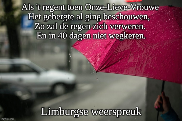 4. Als ’t regent toen Onze-Lieve-Vrouwe Het gebergte al ging beschouwen, Zo zal de regen zich verweren. En in 40 dagen niet wegkeren.