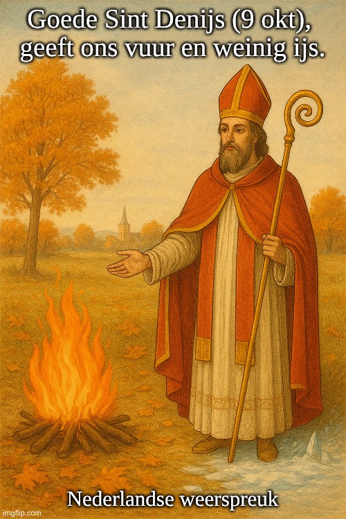 Afbeelding: Peter van Geest AI. Betekenis: Eenvoudig maar symbolisch: “Geeft ons vuur” → staat voor warmte en zon. “Weinig ijs” → verwijst naar kou en vorst. Samen betekent het: Moge Sint-Denijs ons een milde, warme herfst geven en geen vroege winterkou. Oorsprong: De spreuk stamt uit de volksweerkunde, een traditie waarin mensen op heiligendagen het weer observeerden om voorspellingen te doen over het komende seizoen. Sint-Denijs was een belangrijke heilige in de middeleeuwen, vooral in Vlaanderen, Brabant en Frankrijk. Veel dorpen hadden een Sint-Denijskapel of -kerk.