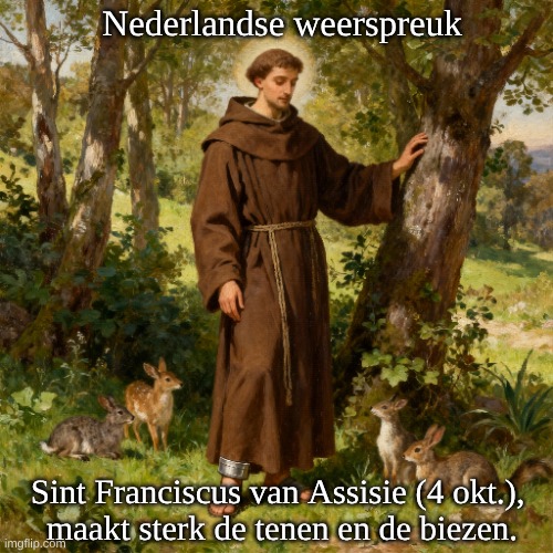Afbeelding: Peter van Geest AI. Betekenis: Mogelijke verwijzing naar de symbolisch beschermende rol van Sint Franciscus van Assisi, een heilige die wordt vereerd als beschermer van mensen, dieren, planten en de natuur. “Tenen” en “biezen” zijn lichaamsdelen en planten, en kunnen in deze context staan voor kwetsbaarheid en eenvoud—twee thema’s die bij het leven en de boodschap van Franciscus passen. De spreuk suggereert dat Franciscus kracht geeft aan wat kwetsbaar is, en dat hij zorg draagt voor de kleine en eenvoudige dingen in het leven. Oorsprong: regionale volkswijsheid of een eigentijdse uitdrukking geïnspireerd door het gedachtegoed van Franciscus; veel moderne gebeden en gezegden worden aan hem toegeschreven zonder historische basis. De echte Franciscus leefde van 1182 tot 1226 en liet maar weinig eigen teksten na, waaronder het beroemde Zonnelied, een lofzang op de schepping, maar deze spreuk is geen onderdeel hiervan.