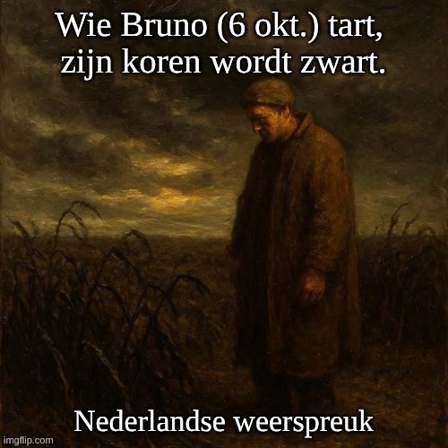Afbeelding: Peter van Geest AI. Betekenis: Verwijst naar een mislukte oogst of ziekte onder het graan. Het is dus een waarschuwing om de heilige te respecteren en mogelijk ook om bepaalde werkzaamheden rond deze datum niet uit te voeren, uit angst voor onheil. Oorsprong: Oude volksweerspreuk, gekoppeld aan de feestdag van Sint-Bruno op 6 oktober. Deze spreuken zijn vaak ontleend aan de agrarische traditie en werden gebruikt om weersvoorspellingen of landbouwrisico’s te koppelen aan heiligen of kalenderdata.