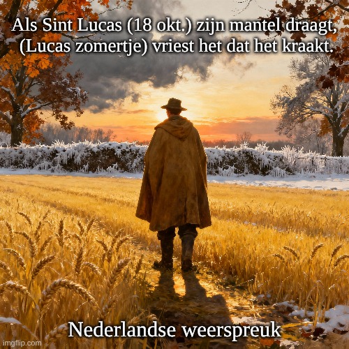 Afbeelding: Peter van Geest AI. Betekenis: De spreuk betekent dat als het rond Sint Lucas’ naamdag (18 oktober) zacht en aangenaam weer is (“de mantel draagt”), het als voorspellende volkswijsheid snel strenge vorst kan volgen (“vriest het dat het kraakt”). Het is dus een weerspreuk met een waarschuwing: een zachte herfstperiode kan een vroege, scherpe winter inluiden. Oorsprong: Sint Lucas verwijst hier traditioneel naar Lucas de evangelist, een Bijbelse figuur, maar deze spreuk komt uit het volksgeloof en de boerenmeteorologie. Rond 18 oktober zijn er in Nederland regelmatig opvallende, korte perioden van zachter weer, aangeduid als het “Lucas zomertje”. De zegswijze duidt op het contrast: als Sint Lucas “zijn mantel draagt” (dus warm weer op zijn feestdag), volgt er vaak een periode van strenge vorst (“het kraakt”).