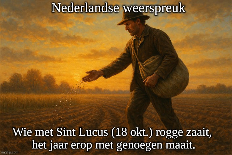 Afbeelding: Peter van Geest AI. etekenis: Uit de volksweerkunde en landbouwtraditie van de middeleeuwen. Oorsprong: Sint-Lucas (de evangelist Lucas) heeft geen directe relatie met landbouw, maar zijn feestdag viel precies in de periode waarin boeren zich bezighielden met het inzaaien van wintergranen. Daardoor werd zijn naam gekoppeld aan dit seizoen en aan agrarische wijsheden. Veel oude spreuken verbinden heiligendagen met landbouw- of weerswaarnemingen, omdat men toen de kalender bepaalde aan de hand van kerkelijke feestdagen.