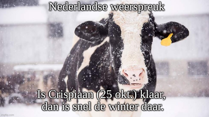 Afbeelding: Peter van Geest AI. Betekenis: Wanneer de periode rond Sint-Crispijn voorbij is, kan men kou en winterweer verwachten — een waarschuwing om voorraden en werkzaamheden tijdig af te ronden. Oorsprong: De uitdrukking komt voort uit volksweerkunde, waarin heiligendagen vaak gebruikt werden als tijdsaanduiding voor seizoensveranderingen. In dit geval markeert “Crispiaan klaar” het einde van het najaar: als het werk rond die datum voltooid is, kondigt de natuur de winter aan. De heiligen Crispinus en Crispinianus waren volgens de overlevering twee schoenmakers en missionarissen uit de 3e eeuw die als martelaren stierven. Hun naamdag was in de agrarische kalender een herkenningspunt voor het naderende winterseizoen.