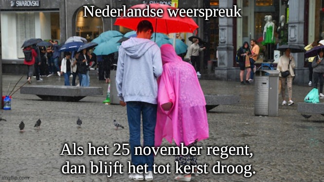 Foto: rtl.nl. Betekenis: Een natte 25 november zou een teken kunnen zijn dat de komende weken relatief droog blijven, tot aan de kerstdagen. Oorsprong: Nederlandse boeren- volkswijsheid.