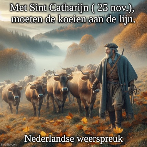 Afbeelding: Peter van Geest AI. Betekenis: Rond 25 november brengt de boer de koeien (aangelijnd) naar de wei om te grazen. Oorsprong: Traditionele Nederlandse boeren- en volksspreuk uit de middeleeuwen.