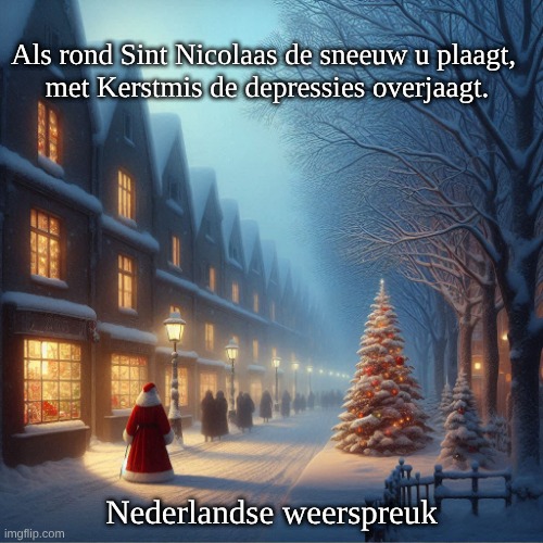Afbeelding: Peter van Geest AI. Betekenis: Een vroege, hevige sneeuwval rond Sint‑Nicolaas wordt gezien als voorbode van een koude, sombere kerstperiode, wat kan leiden tot een minder vrolijke sfeer of “depressieve” gevoelens. Het is een manier om mensen te waarschuwen dat een strenge winter mogelijk een negatieve invloed heeft op de stemming tijdens de feestdagen. Oorsprong: Omdat het een onderdeel is van de orale traditie, is de spreuk anoniem. Hij is door generaties heen mondeling overgeleverd en later gecatalogiseerd door de redacteuren van het Sinterklaaslexicon. Er is geen specifieke schrijver of datum te achterhalen.