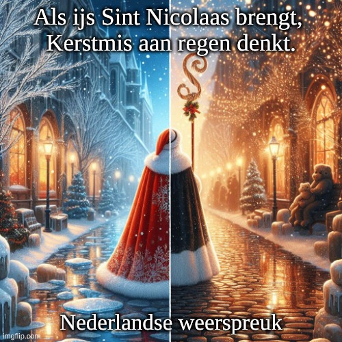 Afbeelding: Peter van Geest AI. Betekenis: Wanneer er rond 5–6 december (de feestdagen van Sint‑Nikolaas) sprake is van ijzige, koude omstandigheden, wordt verwacht dat het rond 25 december (Kerstmis) nat en regenachtig zal zijn. De spreuk dient als een eenvoudige weersvoorspelling: vroeg in de winter koude dagen duiden vaak op een vochtiger, regenachtig einde van de maand. Oorsprong: Het gezegde maakt deel uit van traditionele volkswijsheden die het weer rond heilige dagen koppelen aan het weer later in het jaar. Deze spreuken bestaan al eeuwenlang en werden mondeling overgedragen; er is dus geen individuele auteur bekend, ze behoren tot het collectieve volksverstand.