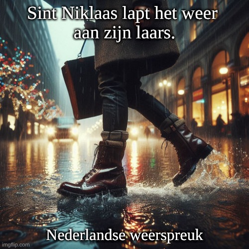 Afbeelding: Peter van Geest AI. Betekenis: Dat het weer rond Sint‑Niklaas (5 december) bijzonder nat of guur is – een aanwijzing voor een natte, koude winter. Het wordt soms ook figuurlijk gebruikt om aan te geven dat men zich niet laat beïnvloeden door het weer. Oorsprong: Het gezegde behoort tot de traditionele Sinterklaas‑weerspreuken en wordt vermeld in het Sinterklaaslexicon — een verzameling van volkswijsheden rondom de feestdag van Sint‑Niklaas. Er is geen individuele auteur; het is een folkloristisch gezegde dat al generaties lang mondeling wordt doorgegeven.
