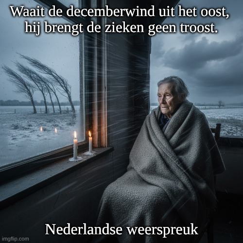 Afbeelding: Peter van Geest AI. Betekenis: De spreuk drukt een oude volkswijsheid uit over het weer en gezondheid. Een oostenwind in december werd geassocieerd met koud, droog en schraal weer dat bijzonder hard kon zijn voor kwetsbare en zieke mensen. In de volksoverlevering gold de oostenwind vaak als een ongezonde wind. Oorsprong: Dit type weerspreuk komt uit de Nederlandse folklore en boerenwijsheden. Het hoort bij een rijke traditie van weerspreukjes en volkswijsheden over de seizoenen die generaties lang mondeling zijn overgeleverd. Zulke spreuken werden gebruikt om het weer te voorspellen of om leefregels door te geven. Er is geen specifieke auteur aan te wijzen. Dit soort volksspreuken zijn anoniem en ontstonden in de loop der eeuwen binnen de agrarische gemeenschap. Ze werden van generatie op generatie doorgegeven en pas later opgetekend in verzamelingen van Nederlandse spreekwoorden en volkswijsheden.