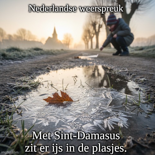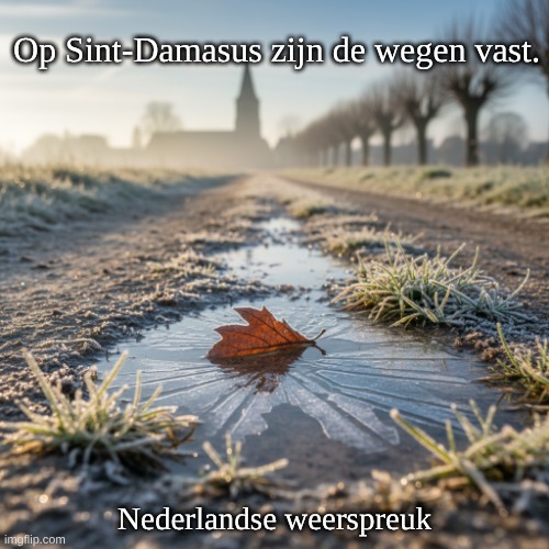Afbeelding: Peter van Geest AI. Betekenis: Letterlijk: Tegen of op 11 december (Sinte Damasus) vriest het vaak zó, dat plassen ijs dragen; de grond “staat vast”. Functioneel: Marker voor de start van de winterkou en een geheugensteun voor boeren en reizigers. Impliciet: Als er tegen 11 december nog geen vorst is, wordt dat als “laat” of uitzonderlijk zacht gezien (volksduiding, geen vaste regel). Oorsprong: 11 december is de feestdag van Sint-Damasus (Paus Damasus I). In de Lage Landen wordt die datum in volksweerkunde traditioneel gekoppeld aan de eerste echte vorst.