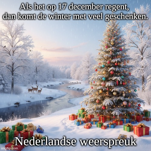 Afbeelding: Peter van Geest AI. Betekenis: Deze weerspreuk suggereert dat als het op 17 december regent, dit een teken is dat de winter rijk en overvloedig zal zijn. Het idee is dat regen in deze tijd van het jaar wijst op een milde winter met mogelijk veel sneeuw en andere winterse “geschenken”. Oorsprong: De oorsprong van deze spreuk ligt in de traditionele Nederlandse en Vlaamse folklore, waar weersvoorspellingen vaak gebaseerd zijn op observaties van de natuur. Veel van deze spreuken zijn door de eeuwen heen doorgegeven en weerspiegelen de menselijke ervaring en de afhankelijkheid van seizoensgebonden weersomstandigheden. December is een maand waarin veel mensen zich voorbereiden op de winter en de feestdagen, waardoor deze spreuken extra betekenis krijgen in de context van overvloed en voorbereiding. Auteur: Deze specifieke weerspreuk heeft geen bekende auteur, aangezien het een volkswijsheid is die waarschijnlijk door generaties heen is doorgegeven. Het is gebruikelijk dat dergelijke spreuken ontstaan in de gemeenschap en niet aan één persoon kunnen worden toegeschreven. Conclusie: Weerspreuken zoals deze zijn een fascinerend onderdeel van culturele tradities en weersvoorspellingen, en ze bieden een blik op hoe mensen in het verleden de natuur en de seizoenen interpreteerden.