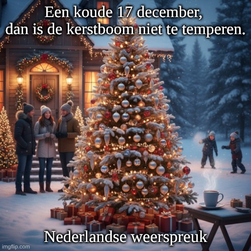 Afbeelding: Peter van Geest AI. Betekenis: De uitspraak “Een koude 17 december, dan is de kerstboom niet te temperen” suggereert dat wanneer het koud is in het midden van december, mensen de neiging hebben om hun kerstversieringen en lichten uitbundiger en met meer enthousiasme te tonen. Het idee is dat de koude weeromstandigheden de feestelijke sfeer versterken, waardoor men minder terughoudend is in het versieren. Oorsprong:Culturele Context: Dit gezegde lijkt voort te komen uit de Nederlandse cultuur, waar het vieren van Kerstmis en de versiering van kerstbomen een belangrijke traditie is. Koud weer in december wordt vaak geassocieerd met de feestdagen, wat kan bijdragen aan een meer feestelijke en uitbundige sfeer. Auteur: Het is niet duidelijk wie de specifieke auteur van dit gezegde is, aangezien het lijkt te gaan om een volkswijsheid of een gezegde dat in de loop der tijd is ontstaan binnen de samenleving. Het kan afkomstig zijn van een verzameling van culturele ervaringen en observaties over de winterse feestdagen. Conclusie: Dit gezegde benadrukt de invloed van het weer op menselijke emoties en tradities, vooral rond de feestdagen. Het weerspiegelt de manier waarop cultuur en natuur met elkaar verweven zijn in de viering van Kerstmis.