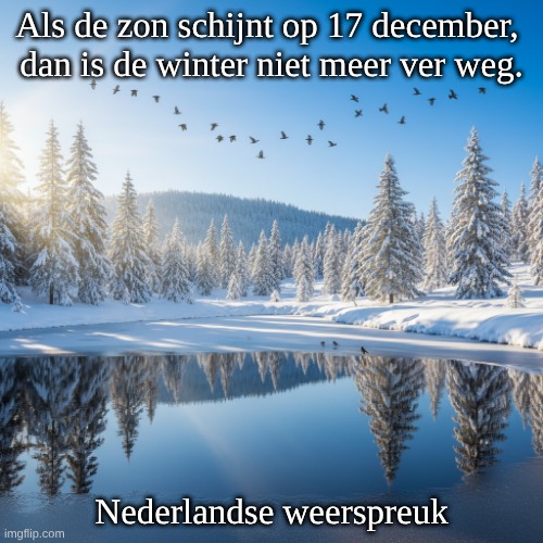 Afbeelding: Peter van Geest AI. Betekenis: Dit is een weerspreuk die aangeeft dat als het op 17 december zonnig is, dit een teken kan zijn dat winterse weersomstandigheden in aantocht zijn. Het suggereert een verband tussen het weer op deze specifieke dag en de naderende winter. Oorsprong: Deze spreuk komt uit de Nederlandse folklore en weersvoorspellingen. Veel van dit soort spreuken zijn ontstaan uit observaties van seizoensgebonden weerpatronen en worden van generatie op generatie doorgegeven. Auteur: De exacte auteur van deze spreuk is onbekend, aangezien het waarschijnlijk een traditioneel gezegde is dat door de jaren heen is ontstaan en zich heeft verspreid binnen de cultuur. Extra Informatie: Dit soort weerspreuken zijn vaak gebaseerd op lokale ervaringen en kunnen variëren tussen verschillende regio’s. Ze worden soms gebruikt om de weersvoorspellingen te helpen interpreteren, vooral in agrarische gemeenschappen.