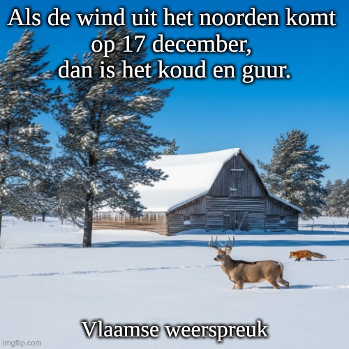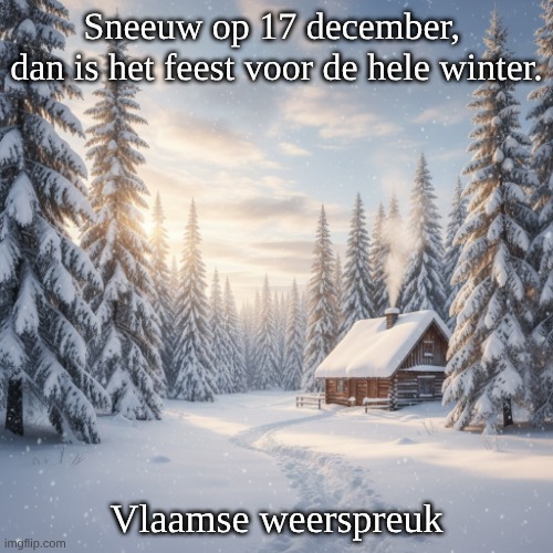 Afbeelding: Peter van Geest AI. Betekenis: De uitdrukking suggereert dat sneeuwval op 17 december een goed teken is voor de rest van de winter. Het impliceert dat als er sneeuw valt op deze datum, dit kan leiden tot een feestelijke en mooie winterperiode. Oorsprong: Deze uitdrukking is een voorbeeld van Nederlandse folklore en weerspreuken, die vaak verband houden met seizoensgebonden verwachtingen en agrarische tradities. Het is mogelijk dat deze spreuk zijn oorsprong vindt in de agrarische samenleving, waar het weer een cruciale rol speelde in het leven en de oogsten. Auteur: De specifieke auteur van deze spreuk is niet bekend, aangezien het waarschijnlijk een traditionele uitdrukking is die door de tijd heen is doorgegeven binnen de Nederlandse cultuur.