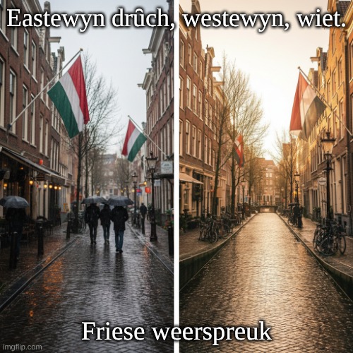 Afbeelding: Peter van Geest AI. Betekenis 💨➡️🌤️ | 💨⬅️🌧️ : Letterlijk: Oostenwind is droog; westenwind is nat. Vrij vertaald: wind uit het oosten brengt meestal droger (en vaak helderder) weer; wind uit het westen brengt vaker regen. Taal en spelling.Taal: West-Fries (Frysk). Vorm: gebruikelijk is “drûch” (met û) en “East(e)wyn”/“Eastenwyn”. De variant “drȗch” is een niet-standaard diakritische weergave. Interpunctie: doorgaans zonder komma na “westewyn”:“Eastewyn drûch, westewyn wiet.” Oorsprong en achtergrond:Herkomst:Friese/kust-Nederlandse volkswijsheid, bekend uit mondelinge traditie en verzamelingen van Friese spreekwoorden. 🧭 Meteorologische basis: Westenwinden in de Lage Landen voeren maritieme, vochtige lucht aan vanaf Noordzee / Atlantische Oceaan → vaker neerslag. 🌊. Oostenwinden voeren continentale, drogere lucht aan → gemiddeld droger en helderder weer. 🌍 Auteur: Geen individuele auteur; het is een traditionele weerspreuk (anonieme volkswijsheid). ✍️ Gebruik en context: Gebruikt om het weer kort te duiden/voorspellen op basis van windrichting, vooral in Friesland en andere kustregio’s. 🧭🌦️.