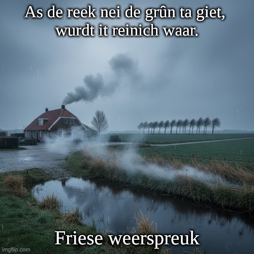 Afbeelding: Peter van Geest AI. Betekenis📜 :Vrije vertaling (NL): “Als de rook naar de grond trekt, wordt het regenachtig weer.” Uitleg: Wanneer rook niet recht omhoog stijgt maar zakt of laag blijft hangen, duidt dat meestal op: Dalende luchtdruk. Hoge luchtvochtigheid, een temperatuurinversie of weinig thermische opstijging. Dit zijn typische voorboden van neerslag, waardoor de spreuk vaak klopt, al is het geen waterdichte voorspelling. 🌧️🌍 Oorsprong:Taal/streek: West-Fries (Frysk), uit de provincie Fryslân (Nederland). Traditie: Een klassieke weerspreuk uit de volksmeteorologie, doorgegeven via mondelinge traditie (boeren, vissers/zeelui). Context: Vergelijkbare weerswijsheden bestaan in meerdere talen/streken, wat wijst op een gedeelde praktische observatie in pre‑meteorologische tijden. ✍️ Auteur: Geen individuele auteur; het is een anonieme volkswijsheid (collectieve traditie). 🔤 Taalopmerking: Oorspronkelijke Friese vorm: “As de reek nei de grûn ta giet, wurdt it reinich waar.” Reek = rook, grûn = grond (let op de û), reinich waar = regenachtig weer. 🧪 Korte wetenschappelijke onderbouwing: Lage druk + hoge vochtigheid vóór een front maken de lucht “stabiel” en vochtig; rookpluimen hebben minder opwaartse kracht en verspreiden zich horizontaal of dalen. Inversies (koele, zware lucht aan de grond) kunnen rook dichtbij de grond vasthouden—een bekend signaal van naderend slecht weer.