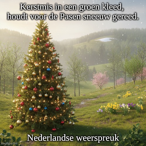 Foto: Christin Hume. Betekenis:Groene Kerst: Dit verwijst naar een Kerstmis zonder sneeuw, wat betekent dat het weer mild is en de natuur nog groen is. Witte Paas: Dit geeft aan dat het Pasen met sneeuw gepaard gaat, wat ongebruikelijk is, maar soms voorkomt. Witte Kerst: Dit betekent dat er sneeuw ligt tijdens de kerstperiode, wat vaak romantisch en feestelijk wordt ervaren. Groene Paas: Dit verwijst naar een Pasen met mild weer en zonder sneeuw, wat een meer lenteachtig gevoel geeft. De spreuk impliceert een weersverbond tussen de seizoenen: wanneer het tijdens de kerst groen is, is de kans groter dat Pasen wit zal zijn en vice versa. Oorsprong: De oorsprong van deze weerspreuk is niet exact te traceren, maar het is een traditionele Nederlandse spreuk die al lange tijd in gebruik is. Het weerspiegelt de seizoensgebonden veranderingen en de verwachtingen van het weer in Nederland, waar het klimaat vaak onvoorspelbaar is. Auteur: De specifieke auteur van deze spreuk is onbekend. Het is een volkswijsheid die door generaties heen is doorgegeven en geen specifieke bron heeft. Conclusie: Deze spreuk is een mooi voorbeeld van hoe mensen het weer en de seizoenen waarnemen en met elkaar in verband brengen. Het draagt bij aan de folklore en de culturele identiteit van Nederland. 🌧️❄️🌱