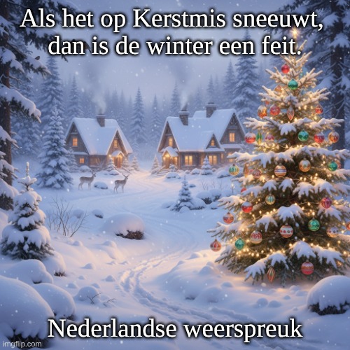 Afbeelding: Peter van Geest AI. Betekenis:Kern: Deze spreuk betekent dat als er op Kerstmis sneeuw valt, dit een indicatie is dat de winter daadwerkelijk begonnen is en dat we waarschijnlijk een strenge winter kunnen verwachten. Interpretatie: Kerstmis valt op 25 december, en sneeuw op deze dag wordt vaak gezien als een teken van een koude en winterse periode die gaat volgen. Het weerspiegelt de overtuiging dat de natuur bepaalde patronen volgt en dat sneeuw rond deze tijd van het jaar een belangrijke indicator is voor het weer in de coming months. Oorsprong:Traditie: Deze spreuk is ontstaan uit oude observaties van het weer en seizoensgebonden veranderingen in de natuur. Het weerspiegelt de afhankelijkheid van agrarische gemeenschappen van seizoensgebonden weersomstandigheden. Culturele context: In veel culturen wordt de kerstperiode geassocieerd met winterse beelden, zoals sneeuw en kou, wat de spreuk extra betekenis geeft in de context van de wintermaanden. Auteur:Anonieme oorsprong: Net als veel andere weerspreuken heeft deze specifieke uitspraak geen bekende auteur. Het is een deel van de volkscultuur en is doorgegeven via mondelinge traditie. Overlevering: Dergelijke spreuken zijn vaak het resultaat van de gezamenlijke ervaringen en observaties van de mensen die in een bepaalde regio leven, waardoor ze moeilijk te traceren zijn naar een specifieke bron of tijd. Conclusie: De spreuk geeft een interessante kijk op de seizoensgebonden veranderingen in het weer en het geloof in de invloed van natuurlijke fenomenen op de komende maanden. Het blijft een relevant en herkenbaar gezegde, vooral in landen waar sneeuw in de winter gebruikelijk is.