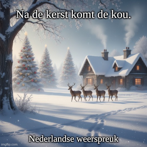 Afbeelding: Peter van Geest AI. Betekenis:Kern: Deze spreuk betekent dat na de kerstperiode (25 december) de winterse kou vaak zijn intrede doet. Het suggereert dat de echte winterse omstandigheden meestal pas na de feestdagen beginnen. Interpretatie: De uitspraak weerspiegelt de ervaring dat de temperatuur vaak daalt en dat er meer kans is op sneeuw en koud weer na de kerstperiode. Het is een waarschuwing voor mensen dat, ondanks de feestelijke sfeer van kerst, de winter nog niet voorbij is. Oorsprong:Traditie: Deze spreuk is ontstaan uit de observaties van het weer en de seizoenen door de jaren heen. In agrarische samenlevingen was het belangrijk om de seizoenen en hun effecten op de landbouw goed te begrijpen. Culturele context: De spreuk is geworteld in de volkscultuur en weerspreuken die vaak van generatie op generatie zijn doorgegeven. Het weerspiegelt de wisselwerking tussen feestdagen en de natuurlijke cyclus van het weer. Auteur:Anonieme oorsprong: Net als veel andere weerspreuken is deze uitspraak anoniem en heeft het geen bekende auteur. Het komt voort uit collectieve ervaringen en observaties van de mensen in de regio. Overlevering: Dergelijke spreuken zijn vaak het resultaat van de gezamenlijke kennis en wijsheid van de gemeenschap, waardoor ze moeilijk te traceren zijn naar een specifieke bron of tijd. Conclusie: De spreuk biedt een inzicht in de seizoensgebonden veranderingen in het weer en herinnert ons eraan dat de winter vaak pas echt begint na de feestdagen. Het blijft een relevant gezegde in de context van de wintermaanden en weersvoorspellingen.