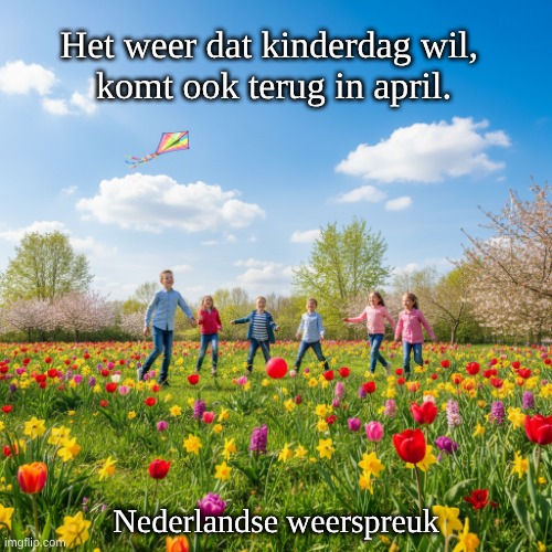 Afbeelding: Peter van Geest AI. Betekenis:Interpretatie: Dit gezegde suggereert dat het weer dat ideaal is voor kinderen (zoals op Kinderdag, 28 dec.) ook weer terugkomt in april. Het kan worden geïnterpreteerd als een boodschap van hoop en optimisme over seizoensveranderingen en de terugkeer van mooi weer. Oorsprong:Seizoensgebondenheid: Het gezegde verwijst naar de typische weersomstandigheden in Nederland, waarbij april vaak wordt gezien als een maand van verandering, met zowel zonnige als regenachtige dagen. Culturele context: Het idee dat het weer kan fluctueren en dat er altijd hoop is op beter weer, is een veelvoorkomend thema in Nederlandse spreekwoorden. Auteur: Onbekend: De specifieke auteur van dit gezegde is niet gedocumenteerd. Het lijkt een traditioneel Nederlands gezegde te zijn dat door de jaren heen is doorgegeven. Samenvatting: Dit gezegde benadrukt de hoop op mooi weer en de cyclicaliteit van seizoenen, iets wat een belangrijke rol speelt in de Nederlandse cultuur. 🌦️