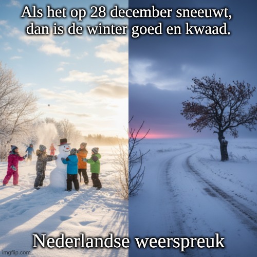 Afbeelding: Peter van Geest AI. Betekenis: Sneeuw op 28 december: De spreuk suggereert dat als het op deze specifieke datum sneeuwt, dit een indicatie is voor de kwaliteit van de winter die volgt. “Goed en kwaad”: Dit kan geïnterpreteerd worden als een balans tussen gunstige en ongunstige winterse omstandigheden. Het kan betekenen dat een sneeuwrijke winter zowel positieve als negatieve aspecten heeft. Oorsprong:Traditionele Spreuken: Deze weerproverbia komen vaak voort uit oude volkswijsheden en zijn door de jaren heen doorgegeven. Ze weerspiegelen de ervaringen en observaties van mensen met betrekking tot het weer en de seizoenen. Seizoensgebonden: De spreuk is specifiek voor de winter en de tijd rond de feestdagen, wat aangeeft dat mensen in het verleden veel belang hechtten aan het weer in deze periode. Auteur:Anonieme Oorsprong: Zoals bij veel traditionele weerspreuken is de auteur vaak onbekend. Deze spreuken zijn meestal collectief ontstaan binnen een gemeenschap en zijn door de tijd heen doorgegeven zonder een specifieke schrijver. Conclusie: Deze spreuk is een mooi voorbeeld van hoe mensen de natuur en het weer observeerden en probeerden te begrijpen, en het blijft een deel van de culturele traditie in Nederland en Vlaanderen.