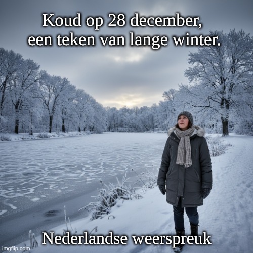 Afbeelding: Peter van Geest AI. Betekenis:Koude op 28 december: Deze spreuk suggereert dat als het op deze specifieke datum koud is, dit een indicatie kan zijn dat de winter langer en strenger zal aanhouden. Lange winter: De implicatie is dat de weersomstandigheden op deze dag een voorspellende waarde hebben voor de rest van het winterseizoen. Koude temperaturen kunnen wijzen op meer kou en sneeuw in de komende weken. Oorsprong:Traditionele Weerspreuken: Dit gezegde is een voorbeeld van een oude volkswijsheid die door generaties heen is doorgegeven. Dergelijke spreuken zijn vaak gebaseerd op observaties van het weer en seizoensgebonden patronen. Agrarische Samenleving: In vroeger tijden waren mensen sterk afhankelijk van het weer voor hun landbouw en dagelijkse leven. Dit soort spreuken hielp hen om zich voor te bereiden op wat komen ging. Auteur:Anonieme Oorsprong: Net als veel andere traditionele weerspreuken, is de auteur van dit gezegde onbekend. Het is ontstaan uit de collectieve kennis en ervaring van verschillende gemeenschappen en is door de tijd heen aangepast en doorgegeven. Conclusie: Deze spreuk weerspiegelt de relatie tussen de mens en de natuur, en hoe mensen door observatie en ervaring de seizoenen en weersveranderingen probeerden te begrijpen. Het blijft een interessante en nuttige manier om naar het weer te kijken, vooral in de context van de winter.