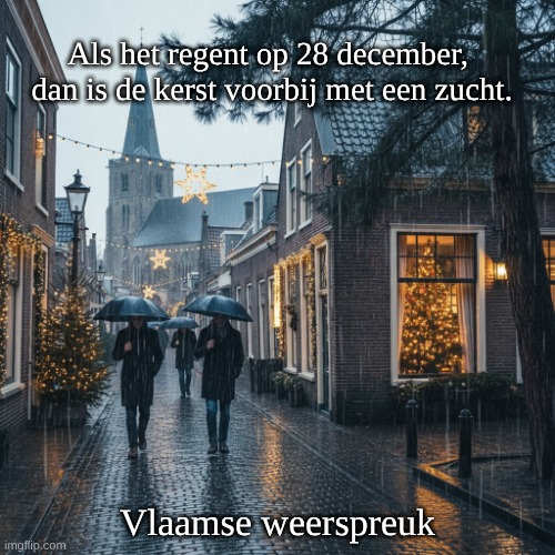 Afbeelding: Peter van Geest AI. Betekenis: Dit gezegde suggereert dat als het op 28 december regent, de feestelijke sfeer van Kerstmis voorbij is en dat mensen weer terugkeren naar de dagelijkse realiteit. De “zucht” kan verwijzen naar een gevoel van teleurstelling of melancholie dat de feestdagen voorbij zijn. Oorsprong: Het gezegde komt voort uit de Nederlandse en Vlaamse volkswijsheid en weerspiegelt de seizoensgebonden verwachtingen en emoties rondom de kerstperiode. Het benadrukt de verbinding tussen het weer en menselijke gevoelens, een thema dat vaak voorkomt in folklore en spreekwoorden. Auteur: De exacte auteur van dit gezegde is onbekend, aangezien het een traditioneel spreekwoord is dat door de jaren heen is doorgegeven in de Nederlandse cultuur. Samenvatting: Een weerspreuk die de overgang van de feestdagen naar de alledaagse realiteit symboliseert. De oorsprong ligt in de Nederlandse en Vlaamse volkswijsheid, zonder een specifieke auteur.