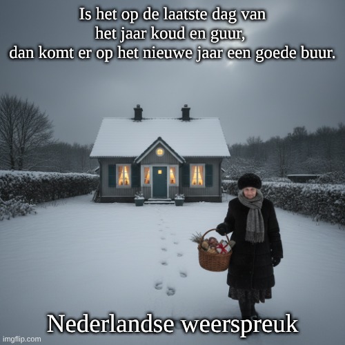 Afbeelding: Peter van Geest AI. Betekenis: Dit gezegde suggereert dat als het op de laatste dag van het jaar koud en guur is, dit een teken is dat er in het nieuwe jaar een goede buur of vriend zal komen. Het impliceert een positieve verandering of een hoopvolle gebeurtenis in het nieuwe jaar, ondanks de onaangename omstandigheden aan het einde van het oude jaar.