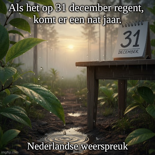 Afbeelding: Peter van Geest AI. Betekenis: Interpretatie: De spreuk suggereert dat regen op de laatste dag van het jaar een aanwijzing is dat het komende jaar veel regenval zal hebben. Het weerspiegelt een populaire overtuiging dat het weer op deze specifieke dag een voorspellende waarde heeft voor het komende jaar. Oorsprong: Traditionele Folklore: Deze spreuk is een voorbeeld van Nederlandse en Vlaamse folklore, waarbij het weer op belangrijke dagen, zoals oudejaarsavond, wordt gebruikt om toekomstige weersomstandigheden te voorspellen. Dergelijke spreuken zijn vaak door de eeuwen heen doorgegeven en zijn geworteld in de agrarische samenleving, waar weer een cruciale rol speelde in het dagelijks leven.