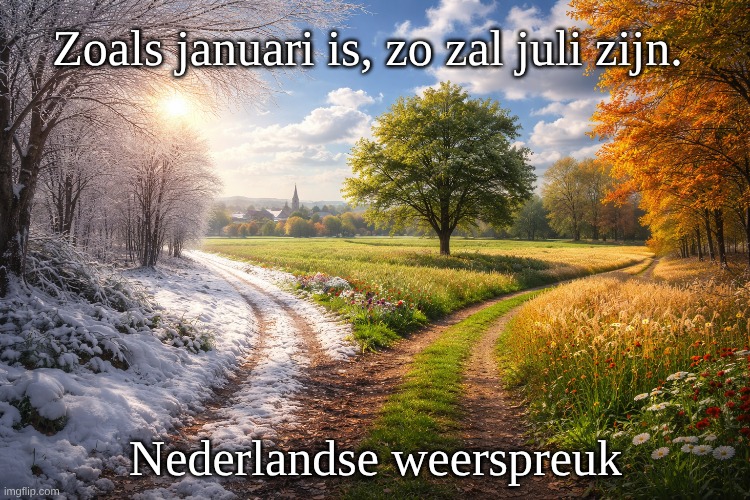 Afbeelding: Peter van Geest AI. Betekenis 📚 :Kernidee: Er is een spiegeling tussen winter- en zomerweer binnen hetzelfde jaar. Interpretatie in de praktijk: Is januari nat → dan zou juli ook nat kunnen zijn. Is januari droog → dan zou juli eveneens droog kunnen uitpakken. Soms wordt het ook breder opgevat als “het algemene karakter” (koud/guur vs. koel/nat) dat terugkomt. 📜 Oorsprong:Volksmeteorologie/boerenwijsheid uit het Noordwest‑Europese taalgebied (met parallellen in het Duits: “Wie der Januar, so der Juli” en in het Engels: “As January is, so is July”). Verspreid via almanakken, boerenkalenders en spreekwoordenverzamelingen (16e–19e eeuw en later). Geen enkelvoudige ontstaansbron; het is een mondeling overgeleverde, regionaal variërende weerspreuk. ✍️ Auteur: Geen auteur: anonieme, traditionele zegswijze (folklore). Niet aan een specifieke dichter, schrijver of meteoroloog toe te schrijven. Handig als cultureel geheugensteuntje of folkloristische wijsheid. 🌍 Context: Past in de bredere traditie waarin mensen patronen zochten in seizoenen en cyclusdenken (symmetrie binnen het jaar).