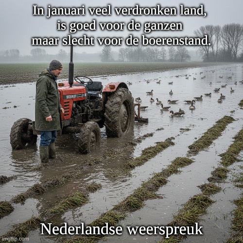 Afbeelding: Peter van Geest AI. Betekenis 📌:“Verdronken land” = ondergelopen land/velden door regen, dooi of hoogwater (overstromende sloten/rivieren) in januari. Goed voor de ganzen 🦢: Overstroomde weiden trekken ganzen en andere watervogels aan; ze vinden er voedsel en beschutting. Slecht voor de boerenstand 🚜: Natte akkers en weilanden betekenen vertraging of schade aan wintergewassen, hogere ziektedruk (rot/schimmel), kapotgelopen grasland en extra kosten. Kern: Een natte januarimaand heeft ecologisch “winnaars” (ganzen), maar agrarisch-economisch “verliezers” (boeren). Oorsprong 🕰️: Volkswijsheid/boerenwijsheid uit de Lage Landen (Nederland en Vlaanderen), waar winterse overstromingen en drassige polders historisch veel voorkwamen. De uitdrukking “verdronken land” is traditioneel Nederlands (bekend ook uit toponiemen als het Verdronken Land van Saeftinghe). Waarschijnlijk mondeling overgeleverd en later in verzamelingen van weerspreuken en almanakken terechtgekomen; exacte eerste datering is niet zeker, maar de formulering past in 19e–20e-eeuwse weer- en boerenwijsheden. Auteur ✍️: Geen individuele auteur; anonieme, collectieve volkswijsheid. Functie: Geheugensteun/observatie in agrarische gemeenschappen over het effect van winterse natte omstandigheden. Taal en woordkeuze 🗣️: “Boerenstand” = de landbouwende bevolkingsgroep (boeren als sociale/beroepsklasse). Stilistisch contrast: “goed voor …” vs. “ slecht voor …” benadrukt tegengestelde impact op natuur en landbouw. Context en achtergrond 🌍: Past bij het klimaat en landschap van de Delta (rivieren, polders, kleigronden) waar winterwaterstanden en waterbeheer cruciaal zijn. Meteorologisch: Een natte januari wijst op veel neerslag, dooiperioden of hoogwater; landbouwkundig extra kwetsbaar door lage verdamping en beperkte bewerkbaarheid van grond in de winter. Varianten 🔁: Kleine verschillen in formulering komen voor in spreekwoordencollecties (bijv. “veel verdronken land in januari”/“als januari veel water geeft …”), maar de strekking blijft gelijk.