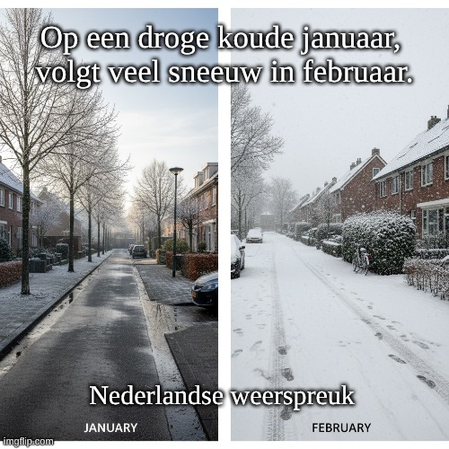 Afbeelding: Peter van Geest AI. 📌 Betekenis: Kern: Als de maand januari droog én koud is, dan zou februari vaak sneeuwrijk zijn. Impliciet idee: Een standvastig, koud-continentale luchtstroming in januari kan aanhouden. Komt er in februari weer vocht bij (Atlantische invloeden) terwijl de lucht nog koud is, dan valt neerslag sneller als sneeuw. 🧭 Oorsprong: Herkomst: Volksweerkunde/boerenwijsheid uit de Lage Landen (Nederland en Vlaanderen). Traditie: Zogeheten weerspreuken circuleren al eeuwen mondeling en werden later gebundeld in almanakken en spreekwoordenverzamelingen. Exacte eerste bron of datum: Niet met zekerheid vast te stellen; het gaat om een traditionele, mondeling overgeleverde spreuk met varianten. ✍️ Auteur: Geen individuele auteur; het is een anonieme volkswijsheid (collectieve overlevering). 🔬 Geldigheid en nuance: Richtlijn, geen harde regel: Soms klopt de samenhang (koude, droge patronen die later “breken” met sneeuwval). 🗣️ Gebruik en varianten: De spreuk komt in licht verschillende bewoordingen voor, maar de strekking blijft: droge, koude januari → kans op sneeuw in februari. In spreektaal wordt soms “januarimaand/februarimaand” gebruikt voor ritme/rijm.