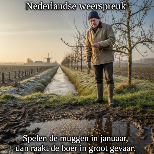Afbeelding: Peter van Geest AI. Betekenis🌡️:“Spelen de muggen” = muggen zwermen/dansen bij zacht, windstil weer. Zachte januari kan leiden tot: Vroeg uitlopen van gewassen → kwetsbaar voor latere nachtvorst. Hogere overwintering en vroegere activiteit van plagen en ziekteverwekkers. Instabiel weerpatroon later in de winter of het voorjaar. Het is een waarschuwing, geen exacte voorspelling: Een volksobservatie van weer en natuur, niet wetenschappelijk hard, maar biologisch plausibel. Oorsprong 📜:Afkomst: Nederlandse/Vlaamse weerspreuken (boerenwijsheid/volksmond). Overlevering: Mondeling doorgegeven; later opgenomen in verzamelingen van weerspreuken en (boeren)almanakken. Datering: Precieze eerste bron onbekend; de formulering is typisch voor 18e–19e-eeuwse boerenkalendertradities. Regionaal wijdverbreid; vergelijkbare sentimenten komen ook in andere Europese talen voor. Auteur 👤: Geen individuele auteur; anonieme, collectieve volkswijsheid.Spelling en vaste vorm ✍️: Gebruikelijke schrijfwijze: “januari” (niet “januaar”). Veelgebruikte vorm: “Spelen de muggen in januari, dan raakt de boer in groot gevaar.” Extra context voor nu 🌱: In zachte winters komen insecten soms tijdelijk in actie; als daarna een koude-inval of late vorst volgt, kan dat landbouwschade vergroten en plaagdruk verhogen. De spreuk vat die ervaring kernachtig samen.