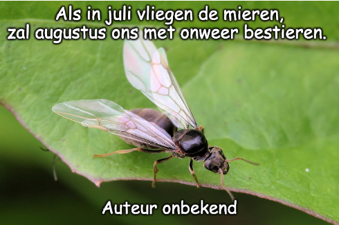 7. Als in juli vliegen de mieren, zal augustus ons met onweer bestieren.